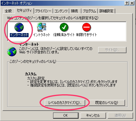 A 「セキュリティ」タブを選択し、ゾーンは「インターネット」を選択して「レベルのカスタマイズ」ボタンをクリック