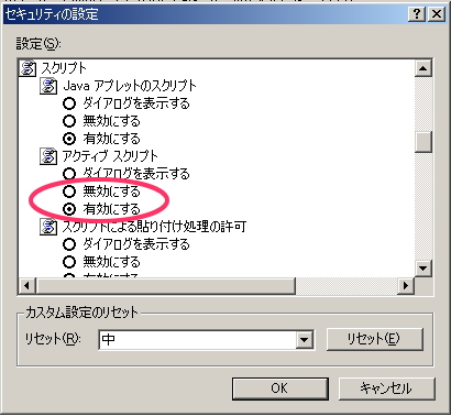B 「スクリプト」の「アクティブスクリプト」が有効になっていれば無効に変更し、「OK」ボタンをクリック