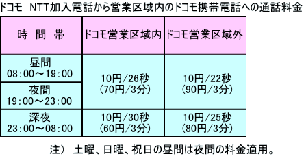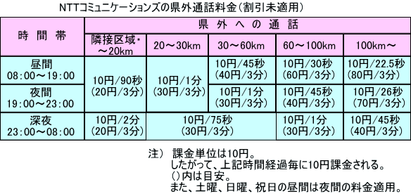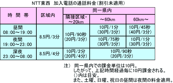 同一県内の加入電話通話料金(NTTコミュニケーションズ、日本テレコムも同額)