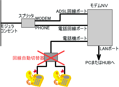 電話機ポートに回線自動切替器を接続するような構成の場合、発信すらできませんでした。