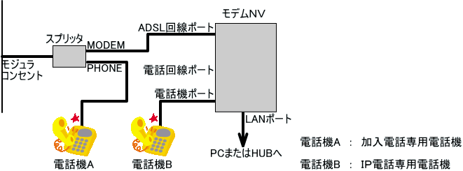 電話機Aからの発信はすべて加入電話を経由します。加入電話の電話番号へ着信の場合は電話機A、電話機Bとも鳴動します。ただし、電話機Bはモデム−NVを経由するため、電話機Aよりも遅れて鳴動し始めます。