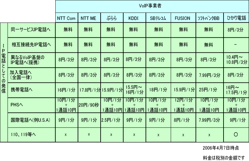 各VoIP基盤網事業者毎の通話料金の概要を調べてみました。詳細は利用するプロバイダの料金表を確認してください。これ以外に月額基本料金がかかる場合もあります。